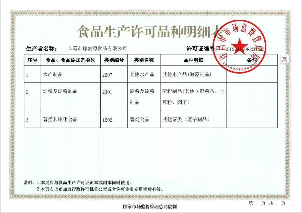 食品生產(chǎn)許可證品種明細(xì)表